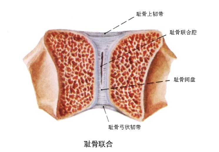 耻骨联合是位于骨盆前正中,两侧耻骨之间的纤维软骨间盘,间盘内有狭小的腔隙。间盘的上面有耻骨上韧带,下面有耻骨下韧带(又称弓状韧带),前面有耻骨前韧带,后面有耻骨后韧带,这些韧带对耻骨间盘起加强作用。这个结构被称为耻骨联合,它将两侧耻骨连接在一起,使骨盆构成一个完整的环。耻骨联合是一个微动关节,因为当我们行走或单腿站立时,耻骨联合可以出现毫米级的微动。