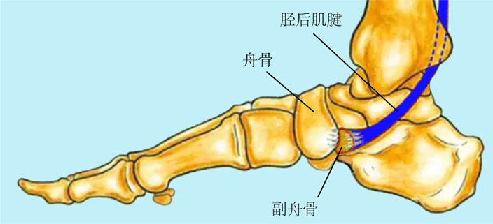 图2:胫后肌腱(蓝色)大部分或完全附着于副舟骨上,导致足部生物力学的异常。
