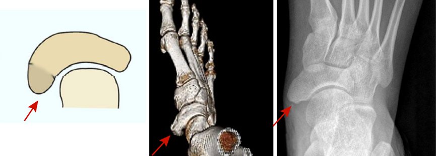 图5:Ⅲ型又称鸟嘴样或角形舟骨,约占4-21%,副舟骨与舟骨融合,关节面消失。此型结构较稳定,偶尔可出现疼痛性滑囊炎。