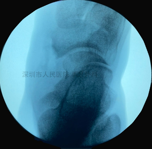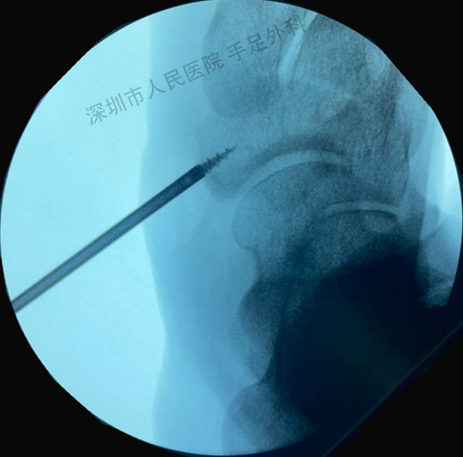 图8:舟骨置入锚钉,重新固定胫后肌腱止点。