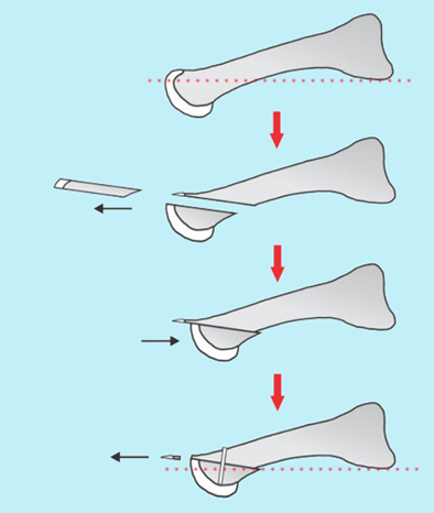 ▶手术治疗的方法是短缩并抬高跖骨,使之承受的应力降低,从而达到缓解疼痛的目的。