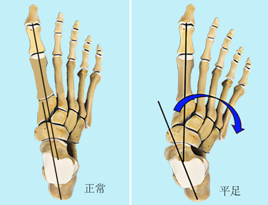 图5:与正常足相比,平足患者的足跟出现外翻。