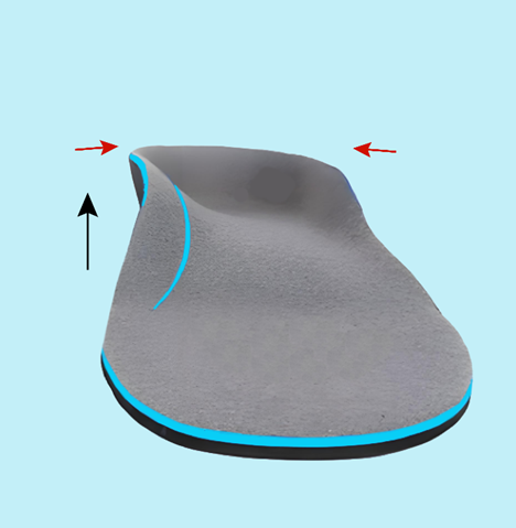 图7:足弓垫的矫形原理,抬高足弓(黑色箭头),纠正足跟外翻(红色箭头)。