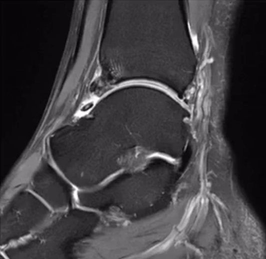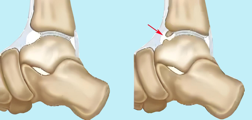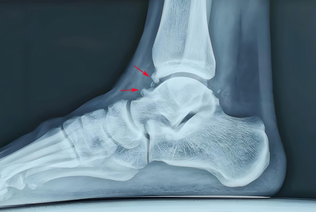 ▶踝关节反复扭伤导致关节不稳定,导致骨和滑膜的增生。