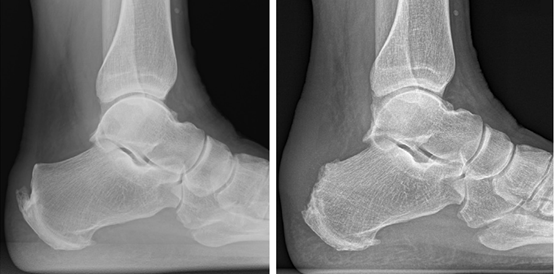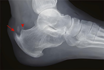 图4:X线检査可见跟腱止点处钙化增生(长箭头), 跟骨后上突增生(箭头)