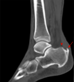 图5:CT检査可见跟腱止点处钙化增生(长箭头), 跟骨后上突增生(箭头)