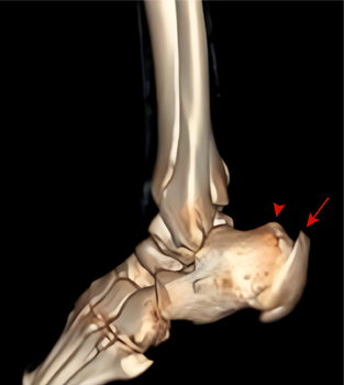 图6:CT检査(3D重建)可见跟腱止点处钙化增生(长箭头), 跟骨后上突增生(箭头)