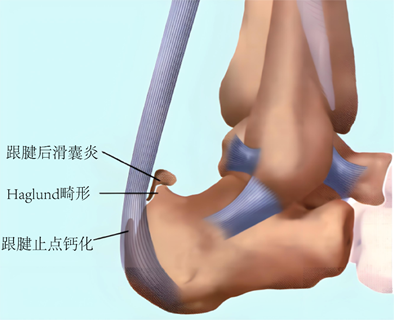 ▶本病为足跟后上方跟腱止点处的无菌性炎症、跟骨后上突增生(Haglund畸形)与跟腱滑囊炎的一组临床征候群。