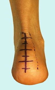 ▶开放性跟腱止点清理术+Hugland结节切除+止点重建术;
