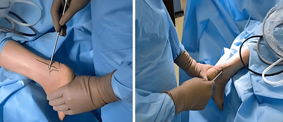 图14:关节镜下跟腱止点清理术,左图为外侧入路,右图为内侧入路。