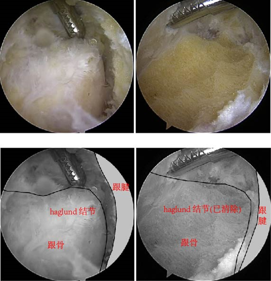 图15:关节镜下跟腱止点清理术,左图为Hugland结节切除前,右图为切除后