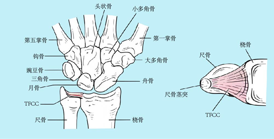 TFCC位于关节囊内,是远端桡尺关节的内在稳定结构,对远端尺桡关节的稳定性,尤其是旋转稳定性贡献很大。外在稳定结构,包括旋前方肌和骨间膜对远端尺桡关节的旋转稳定性作用较小。