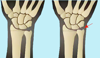 图4:左图为正常尺桡骨长度,右图为尺骨正向变异(箭头)