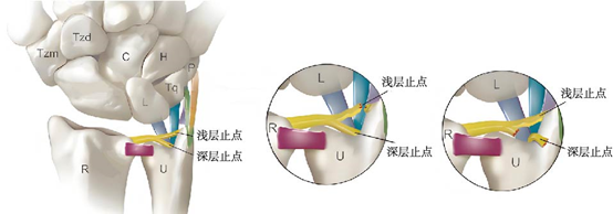 (2)关节软骨盘(TFCC):附着于尺骨茎突基底与桡骨乙状切迹边缘;