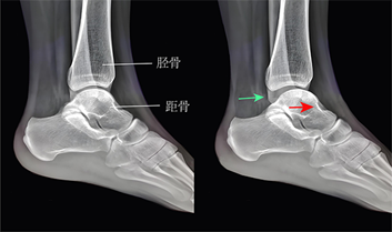 图2:距腓前韧带损伤后,抽屉试验可见距骨前移(右图,红色箭头),踝关节间隙增宽(绿色箭头)