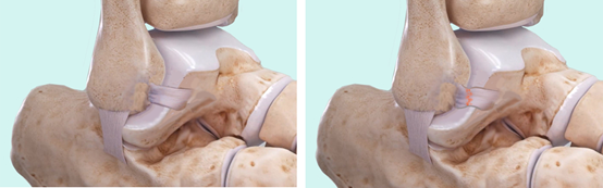 图3:左图为正常距腓前韧带,右图为韧带损伤愈合后,韧带松弛导致踝关节外侧不稳