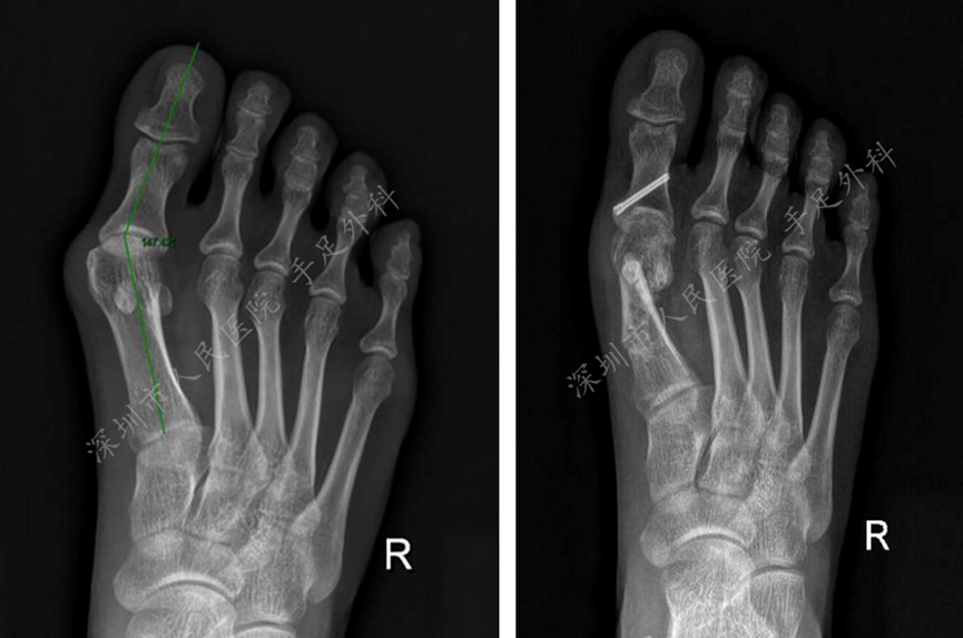 图2:经截骨矫形后(Scarf截骨),拇外翻畸形被矫正。