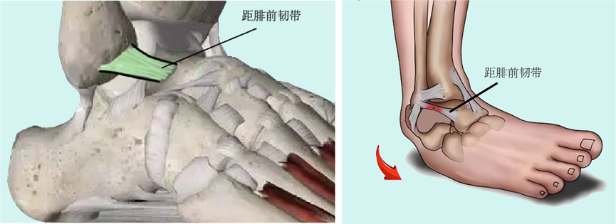 图9:距腓前韧带(绿色)的解剖位置和损伤机制。