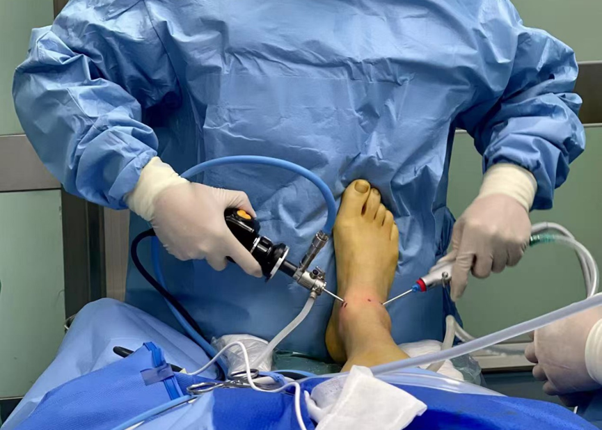 在踝关节扭伤的病例中,外侧韧带损伤最为常见。其中,距腓前韧带是最薄弱、最容易损伤的结构,其撕裂伤的发生率最高。随着对踝关节扭伤的认识有了长足的进步,大部分此类损伤得以早期诊断,经过及时的保守治疗往往能获得满意的疗效,但部分患者仍需手术治疗。本中心通过关节镜微创技术修复踝关节韧带损伤,获得了满意疗效。