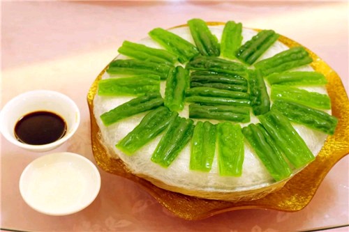 顺德人吃苦瓜,最能体现“食在广州,味在顺德”的精髓。将新鲜苦瓜去瓤后切薄片,用冰水浸泡片刻,捞出沥干,蘸上蒜蓉、生抽、香油调成的酱汁——这道苦瓜刺身,保留了苦瓜最原始的清香,苦味被冰水中和得恰到好处,脆嫩爽口,堪称夏日解暑神器。