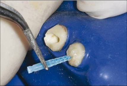 将纤维桩表面涂满调好的树脂水门汀,安放在根管内就位,可轻度敲击就位并保持压力