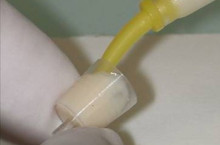 将调好的树脂水门汀用口内注射头送入根管,从根尖部开始逐渐退到桩道口