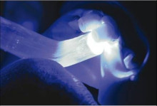 粘接剂均匀地涂抹在纤维桩表面,用纸尖吸去多余的粘接剂,光固桩道、牙体粘接面10-20秒