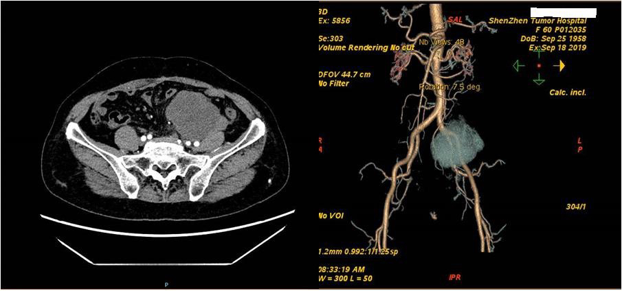 入我院后, 给予完善腹部CT等术前检查,考虑腹膜后-左侧髂窝见不规则分叶状肿块,约8.4×6.7× 7.9cm,包饶左侧卵巢静脉,肿块紧贴左侧髂总动脉、髂内、髂外动脉近端及左侧腰大肌, 左侧输尿管中段受压移位,致左肾轻度积液,考虑肿瘤复发。术前王天宝教授团队经过详细 评估后,考虑肿瘤与左侧输尿管关系密切,请泌尿外科会诊先行左侧输尿管双J管植入术。 完善术前准备后,遂于2019.09.19日全麻行腹膜后复发脂肪肉瘤切除术+部分乙状结肠切除 术+肠粘连松解术+左侧输尿管双J管置入术。术中:见肠粘连严重,小心仔细分离腹腔粘连 后,可见一大小约8*8*7cm肿物,质地硬,活动度差,与乙状结肠及其系膜融合,与左侧输 尿管紧密粘连,遂钝锐性结合逐步分离肿物,并切除部分乙状结肠及其系膜。手术用时3小 时,术中出血约500ml,术后病人安返病房。术后第2日查房,患者生命体征平稳,于床旁坐 起,无明显不适。