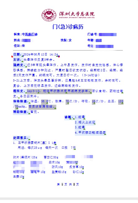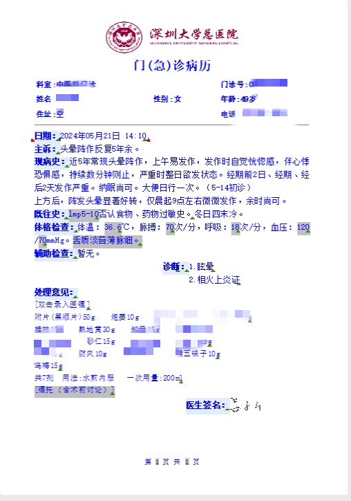共2诊,期间患者出差在外2周未服药,近期复诊,困扰多年之头晕不适近祛,以往经期前后发作欲死,此次仅轻微不适。