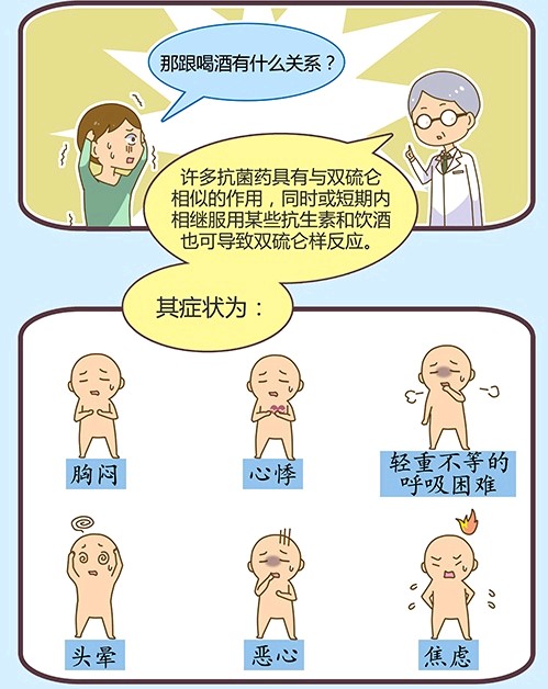 如果吃了酒再吃这些药物的话。比如部分头孢菌素等药物,会产生“双硫仑样”反应,表现为面部潮红、头痛、胸闷、出汗、心悸、呼吸困难等症状,严重时可致死。