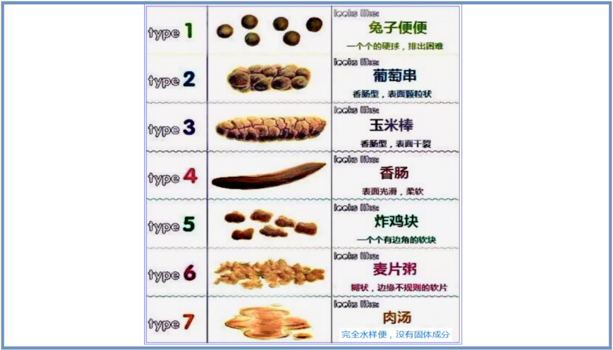 ① 大便的性状(大便的形状、软硬、水分),如图从类型1到7逐渐变稀:类型1~3,较硬大便,提示便秘;类型4~5,较软大便,是正常婴幼儿常见大便性状; 类型6,稀糊状便,是正常新生儿常见的大便性状;类型7,水样便,提示腹泻。