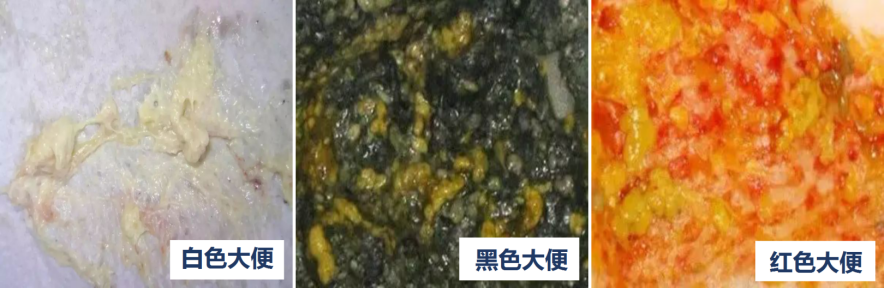 ① 白色大便,白陶土样大便,白石灰样大便,提示可能有先天性胆道闭锁:先天性胆道闭锁,胆汁(胆红素)不能排到肠道中,肠道内容物不能被染色。如果发现孩子大便颜色逐渐变淡,逐步成为白色大便,要当心 !如果孩子持续黄疸,且持续白色大便,要尽早看医生,排除胆道闭锁 !