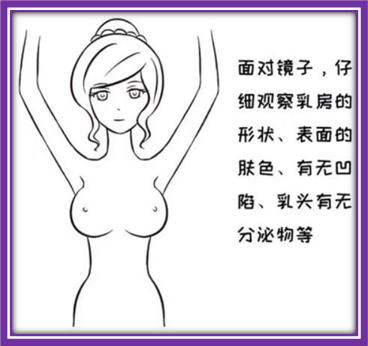 当自己在家里或洗澡时,面对镜子,双手叉腰,裸露上半身,仔细观察乳房大小、轮廓和形状,双乳是否对称,是否在一个水平位,乳头乳晕是否脱屑及糜烂;乳房皮肤是否发红、凹陷、凸起或静脉扩张;乳头是否偏斜或凹陷。进一步将双手放在臀部,上身向前推,拉伸胸肌,观察细微变化,或者把手臂向上举过头顶,拉伸胸肌,观察乳房细微变化。