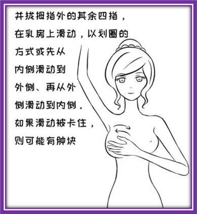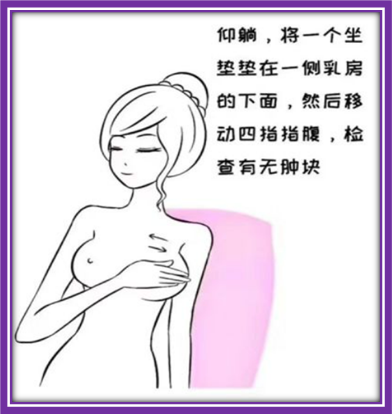 (3)、乳房自检的最佳时间是月经干净后的7-10天,此时容易触摸到乳房异常病变,此外,哺乳期的女性应在乳汁排空后再触诊。