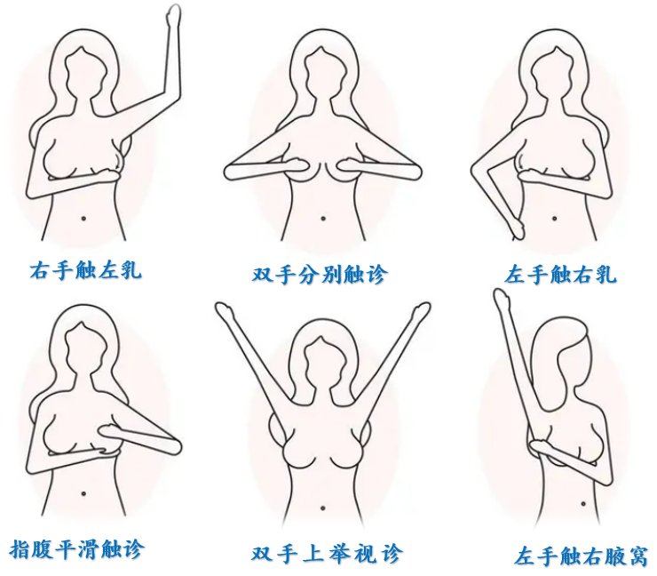 ①、沿乳房从上到下;②、沿乳房从左到右;③、从乳头开始呈同心圆式移动;④、放射性的向外抚摸。每次检查时选择同样的方式,重复三次,力度逐渐加强。最后挤压乳头乳晕区,看乳头是否有溢液或溢血。