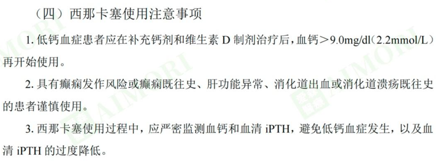 2、当使用西那卡塞小剂量治疗时,甲状旁腺激素未有明显下降,或使用钙剂、骨化三醇时,甲状旁腺激素仍未下降,可以考虑西那卡塞加量。