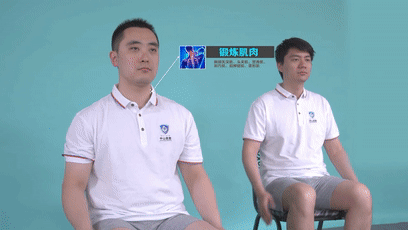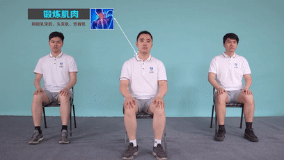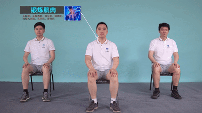上身坐直,双手放置大腿上,腰背挺直,后背贴实椅子。头部按照向前,后,左,右四个方向转动,重复8次。