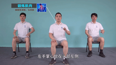 左手掌心放在头部左侧,向右侧发力,头颈向左抵抗左手力量,保持头颈位置不变。右手掌心放在头部右侧,向左侧发力,头颈向右抵抗右手力量,保持头颈位置不变。一共2组,每组各重复8次。