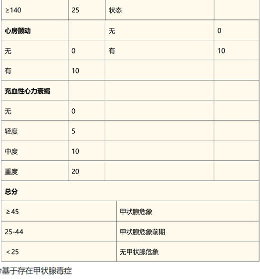 《指南》建议:应在有全身失代偿症状的严重甲状腺毒症患者中考虑甲状腺危象。 1、BWPS评分≥45,考虑存在甲状腺危象,需要积极治疗。
