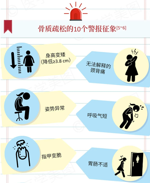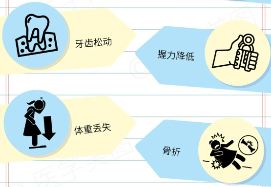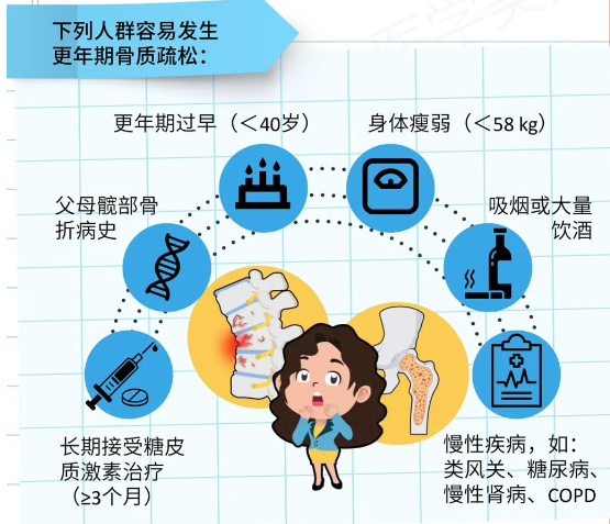 3、骨质疏松的危险因素:如慢性疾病和药物使用,可能导致骨量减少或影响骨微结构和强度。生活方式也会影响峰值骨量、骨质流失率和骨折风险。例如:饮食异常、体重过轻的女性更容易出现低骨量。除了上述因素外,骨折史、骨质疏松症家族史、吸烟、过量饮酒、外伤和虚弱,乳腺癌内分泌药物使用等也与更年期妇女发生骨质疏松的风险相关。