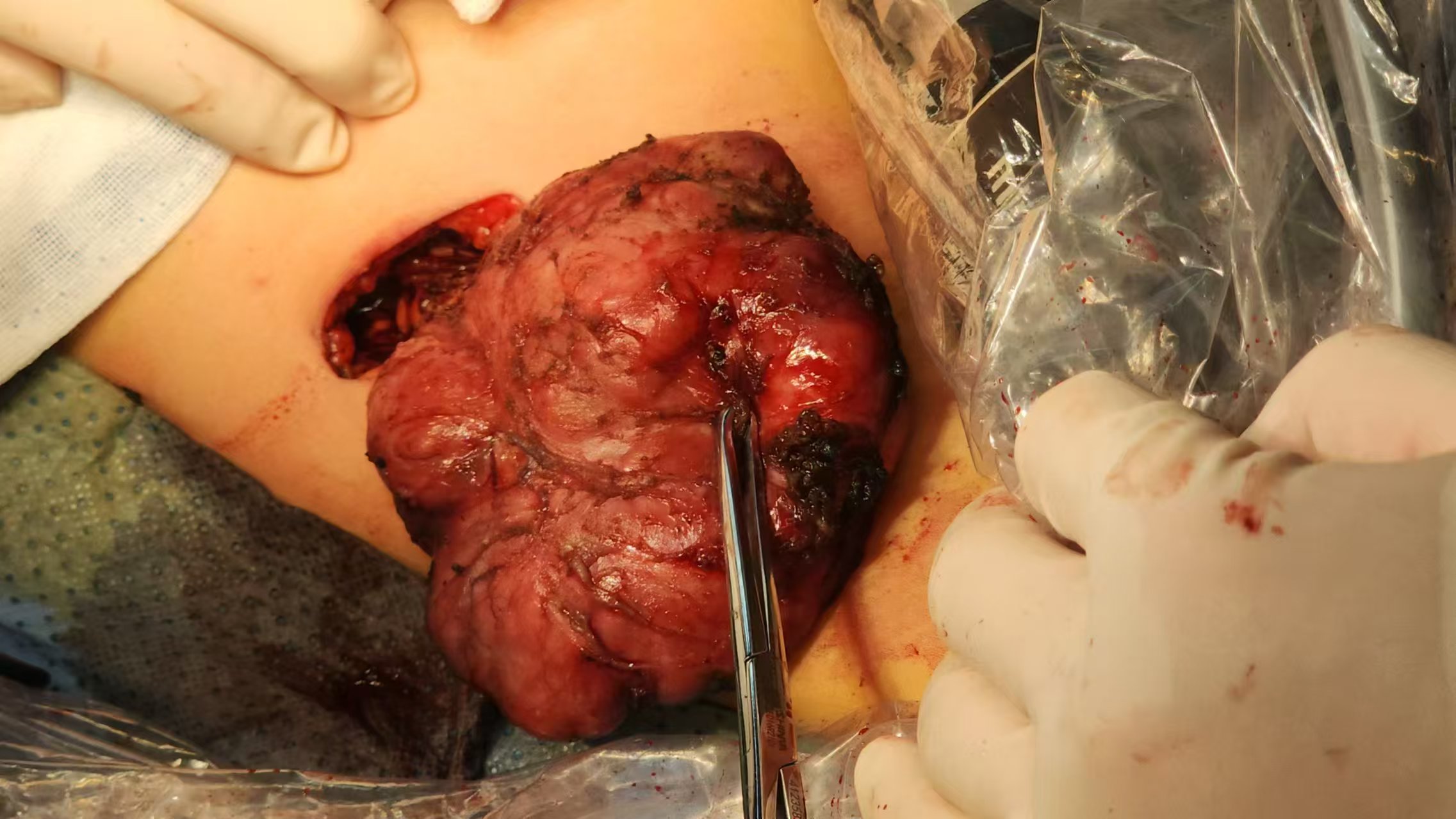 该患者经左腋窝一大小约4cm切口切坐蓐10厘米巨大纤维腺瘤