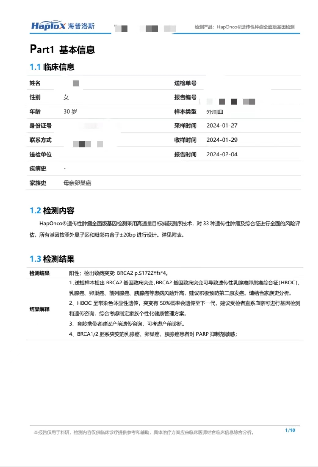 某健康女性,29岁,已婚未育,因母亲患卵巢癌,2个姨妈分别患乳腺癌、宫颈癌,为评估遗传风险门诊咨询。建议行遗传肿瘤基因检测。结果显示:BRCA2突变。
