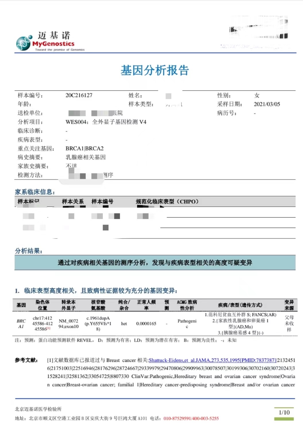 某女性,49岁。44岁时诊断早期乳腺癌(pT1aN0M0 IA期),行手术根治,目前内分泌治疗维持中。母亲、姨妈、姐姐均患卵巢癌,胚系基因检测为BRCA1突变。
