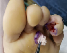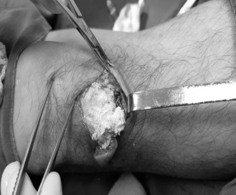 因右足跟外侧反复流脓水,为排除恶变的可能,综合各方面因素,最终选择先对患者在腰硬联合麻醉下行右跟部包块感染扩创,包块切除术,后将包块送病检,最终排除恶变,性质为痛风石。