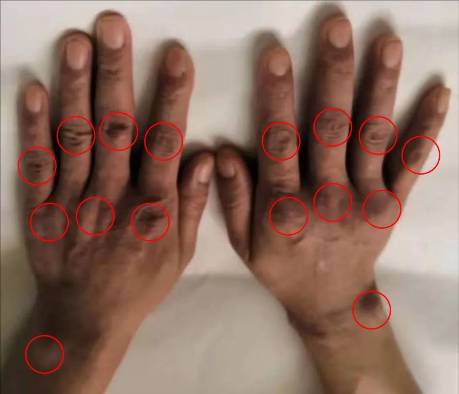 张先生再次入院,初步查体显示:右肘关节后侧、左膝关节髌骨上缘、左膝关节髌骨下缘、右膝关节髌骨上缘双侧、右膝关节髌骨下缘、右外踝、右足背近端等多处包块,左足第四趾末节指腹,性质为痛风石;其余多处关节增粗。