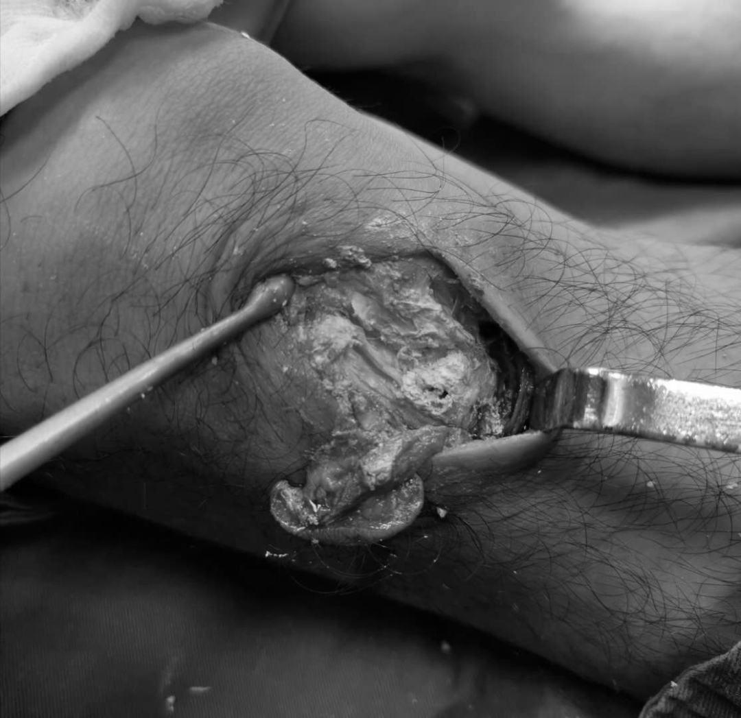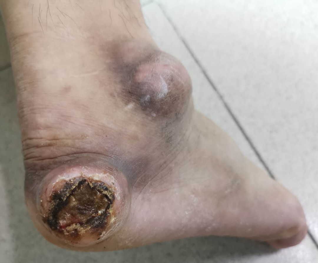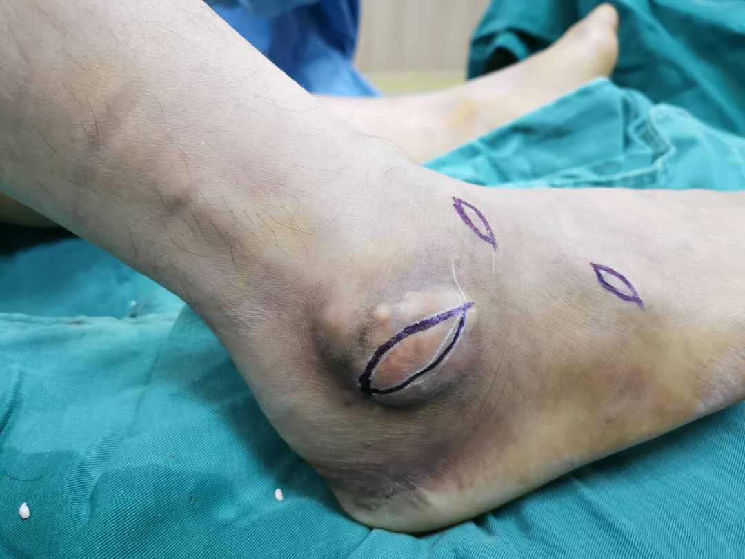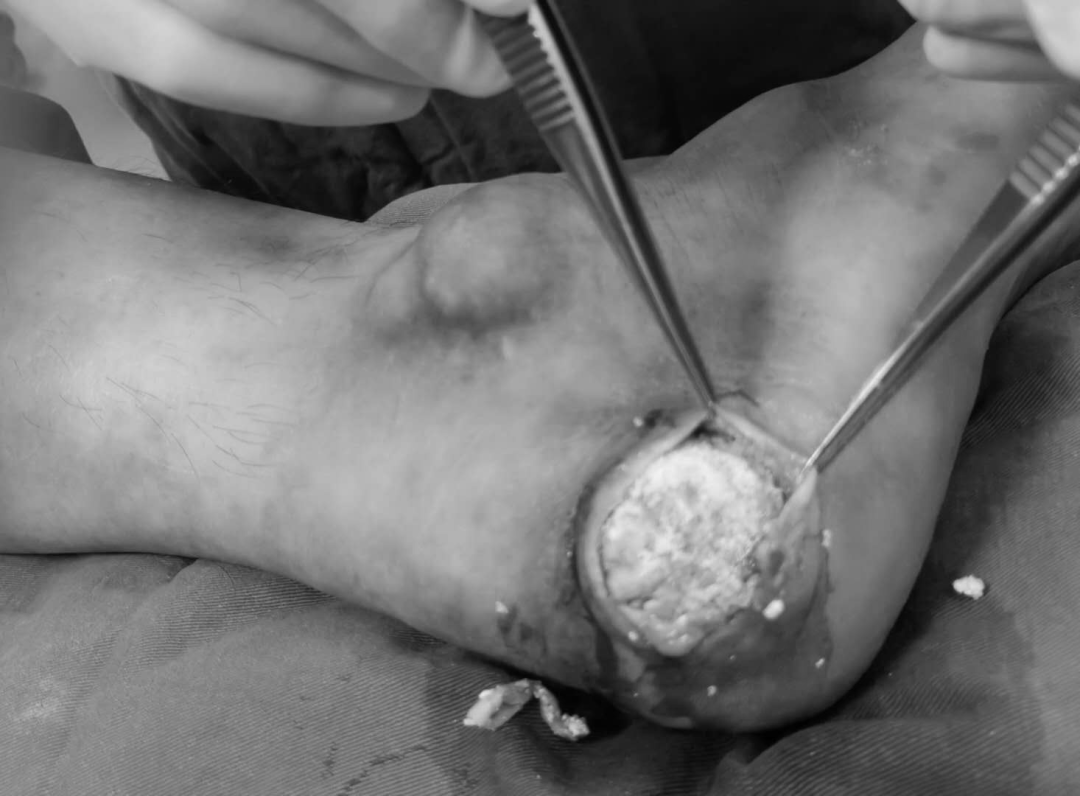 直至今年年中,张先生因右跟部后外侧包块开始出现破溃,反复流脓水六个月,才感觉病情严重,经多方打听后,遂到我院诊治。