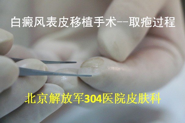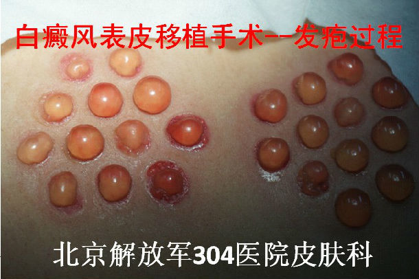 自体表皮移植术运用负压吸引的原理,将多孔吸盘置于正常肤色的皮肤上,吸盘通过管子与一台能够产生负压的装置相联。通过负压,使皮肤的表皮与真皮分离开来,发疱充分后,即可先用皮肤磨削机磨去白斑处表皮,然后再将正常肤色部位表皮水疱覆盖在白斑裸露面,用创可贴或纱布加压包扎固定,无需动刀,不会留下伤疤。以下是我们手术过程真图图解。