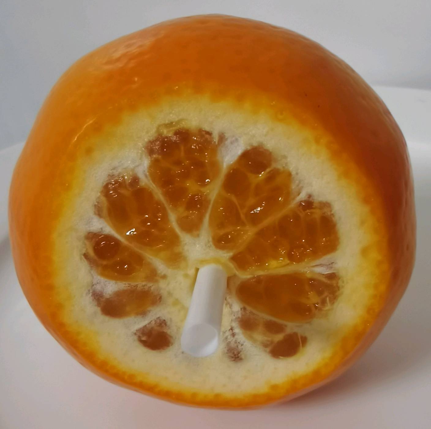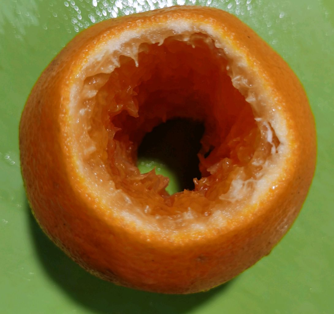 传统的前列腺微创手术是通过尿道放入类似刨刀的手术器械将增生腺体刨成丝再冲出来;拿上图举例,传统的手术方式因为空间的限制无法彻底去除橘子肉,那么就会渗橘子汁,也就是容易出血(见下图)。