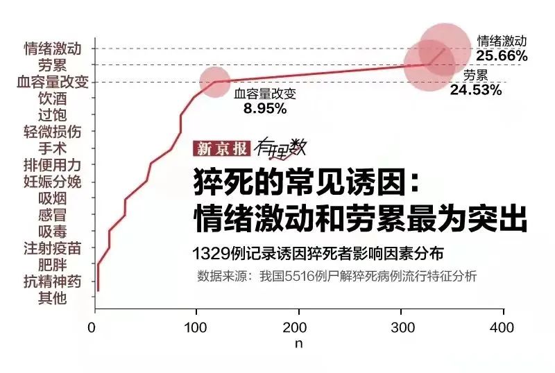 最容易导致人们猝死的原因其实是情绪激动,占所有猝死病例的25.66%,其次才是劳累,占24.53%。