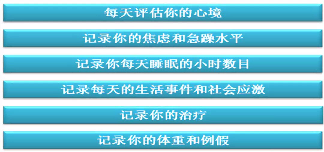 心境表格就是关于情绪状态的日记,它既有情绪的评估,也包括睡眠、药物、生活应激源的信息。填写心境表格既有助于觉察自己的情绪变化,及时进行调整或求助;也可以利用表格中的信息帮助识别不良情绪的触发因素,从而采用压力管理策略减轻此类因素的影响;还能让医生及时了解病情,帮助患者及时调整治疗策略。